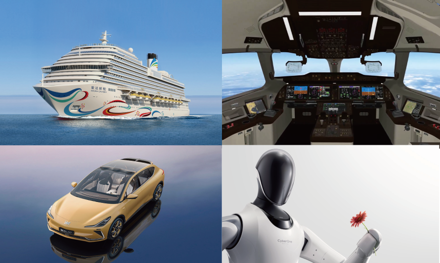 “赋能产业”版块,C919大飞机翱翔蓝天,“爱达魔都号”鸣笛启航,新能源汽车齐头并进,“国和一号”大型核电站压阵,高端装备、智能机器人、绿色低碳、关键零部件百花齐放,设计综合多元素创新力量,为产业发展带来不竭动力和广阔空间。