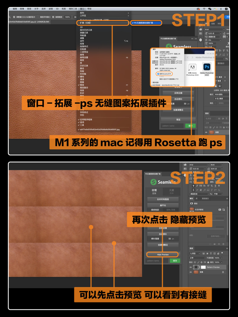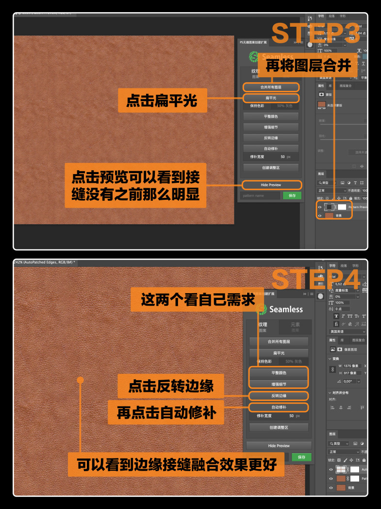🟠 要用的这款ps插件我会上传到群公告里,请仔细阅读安装过程,(这里要注意的是mac m1芯片的用户要用rosetta跑,这样窗口里才有拓展选项)我用一张皮革材质做示范,可以先点击一下预览,可以看到会形成一个九宫格并有明显的接缝,再次点击隐藏预览。然后点击扁平光,合并图层,这时候再点击预览可以看到接缝没有之前那么明显,但是放大看还有一点错位,这时候只需点击反转边缘,自动修补即可。融合的效果就会好很多。