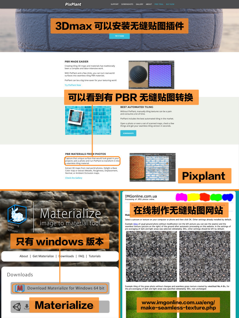 上一篇关于获取pbr贴图,这篇讲讲如何制作无缝贴图,针对水泥,皮革,大理石,砖瓦石块这类材质,无缝贴图可以避免在缩放贴图的时候,贴图之间产生明显拼接的缝隙。最通用的方法是用ps的插件,当然3dmax可以安装pixplant,还有在线的制作无缝贴图的网站imgonlin