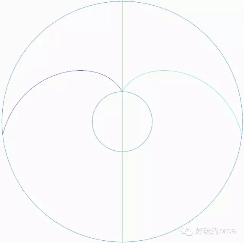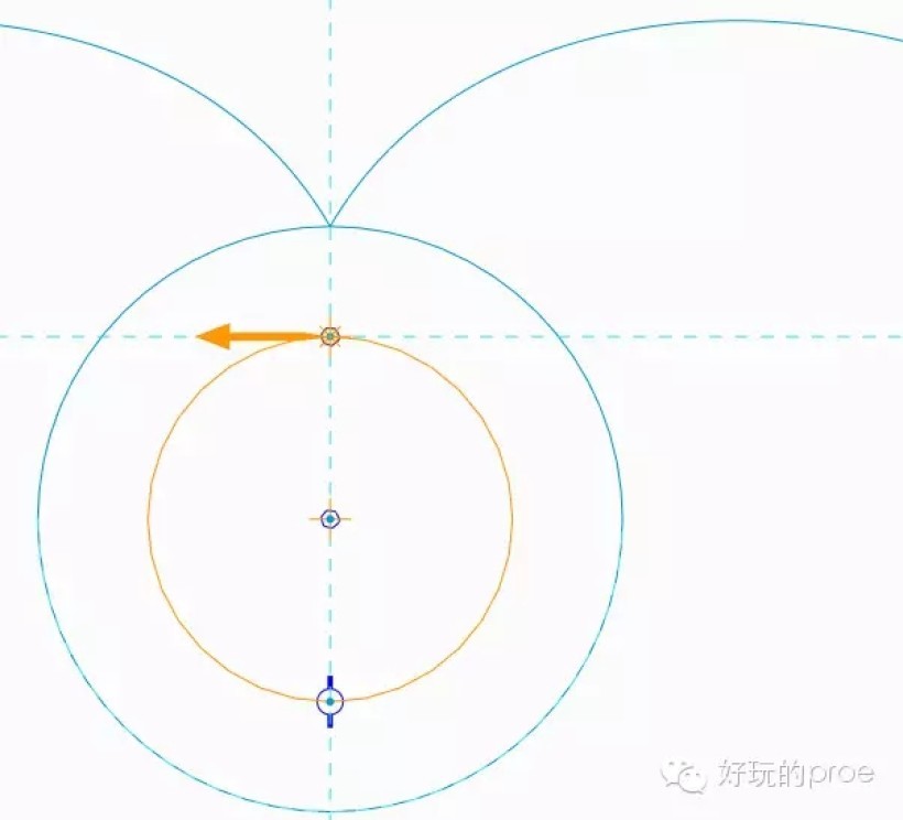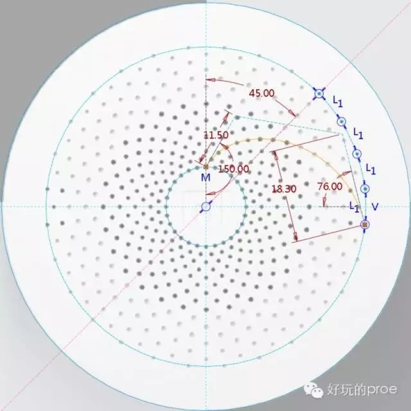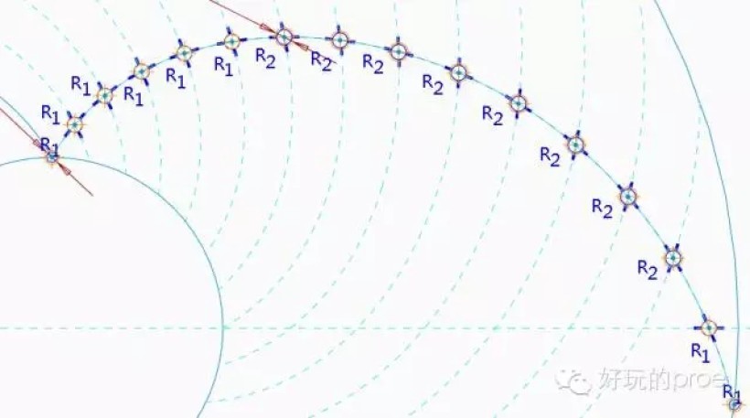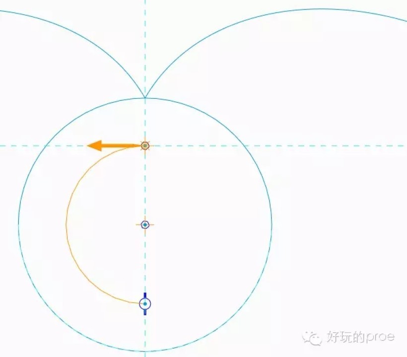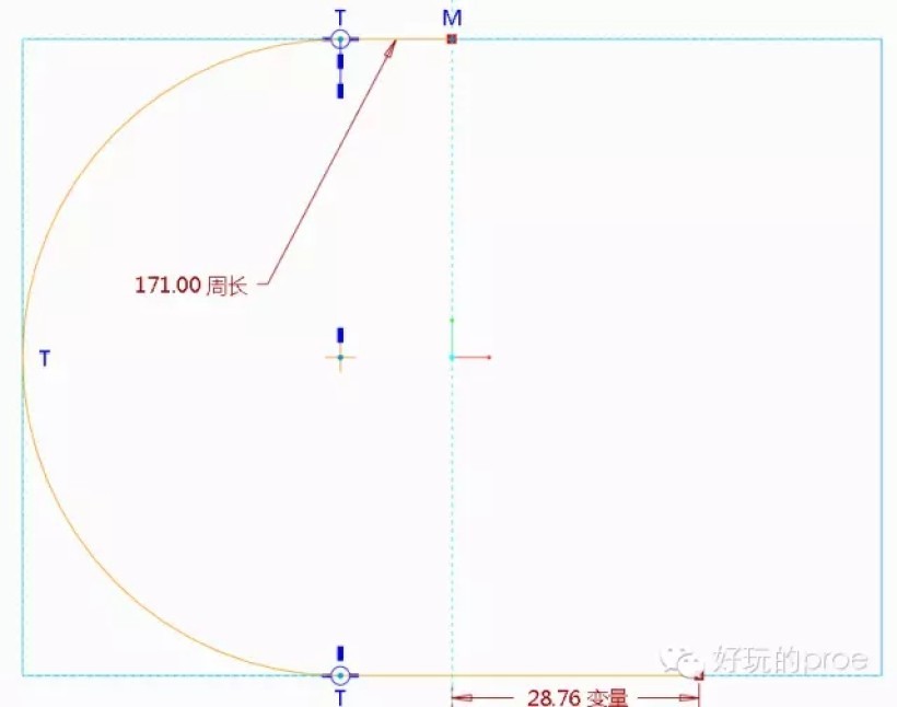 4、草绘孔排列曲线,特别注意曲线的外围的端点位置为几何约束,这样可以精确控制。