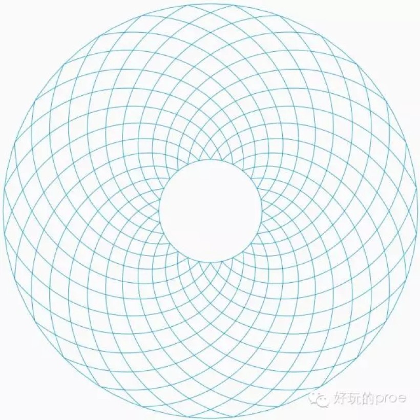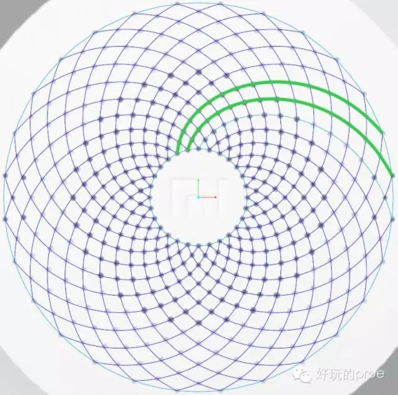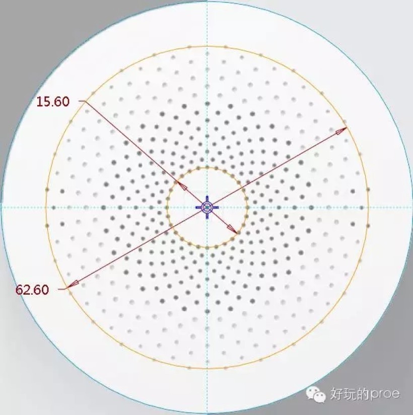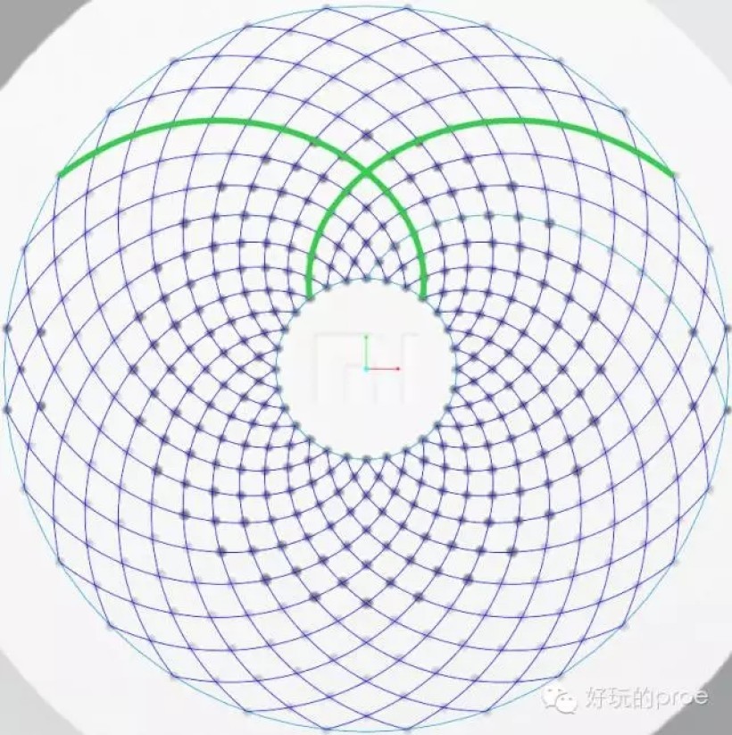 7、选择曲线阵列,为什么不选择轴阵列呢?因为此阵列数为28个,阵列的角度增量不能整除,会产生误差。我们注意到草绘中的原点、X轴和Y轴是软件自动产生的,我们草绘的几何起点就是原点。