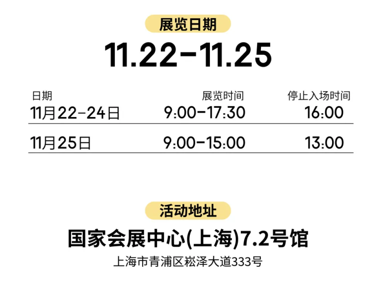2)为了观展舒适度,本届艺术节实行按场次时段实名制购票。11月22日-11月24日开放时间为9:00-17:30,11月25日为9:00-15:00,请留意场次入场与退场时间。
