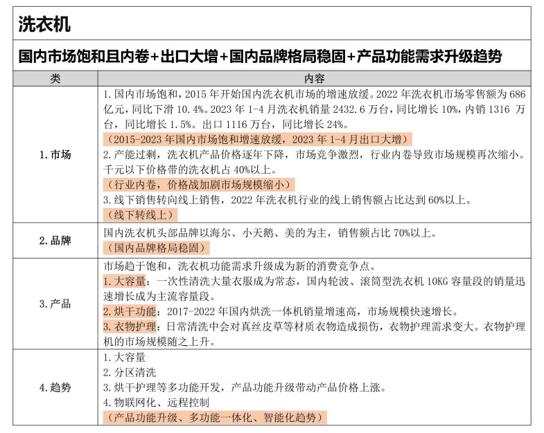 洗衣机是我们生活中不可或缺的产品。用户对衣物洗护的需求升级,使洗衣机的功能不断开发衍生出新的产品,带动洗护行业的消费增长。市场调研为产品设计提供方向,以下是洗衣机的市场部分调研: