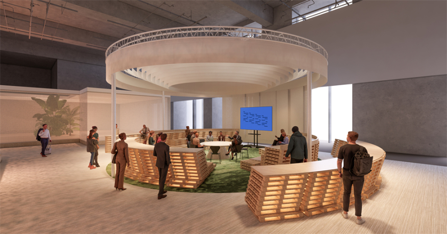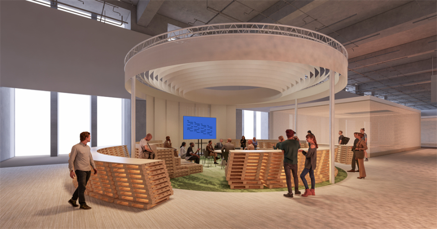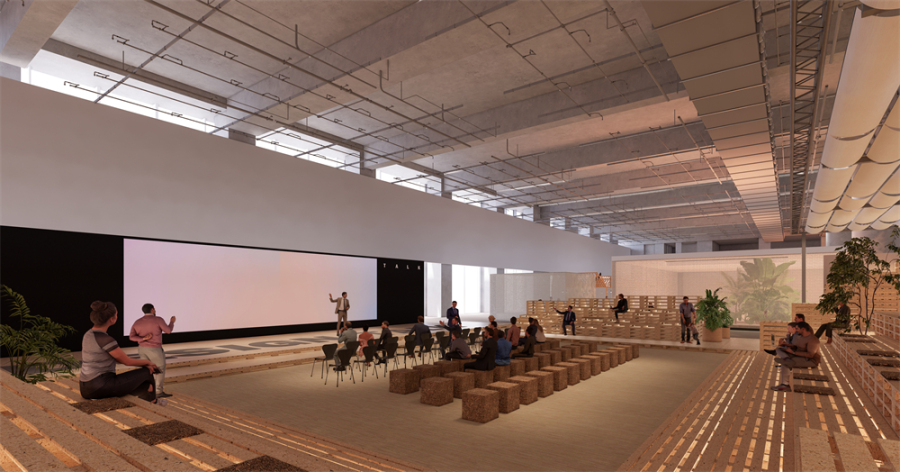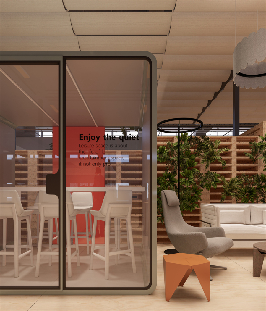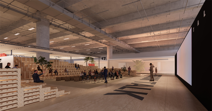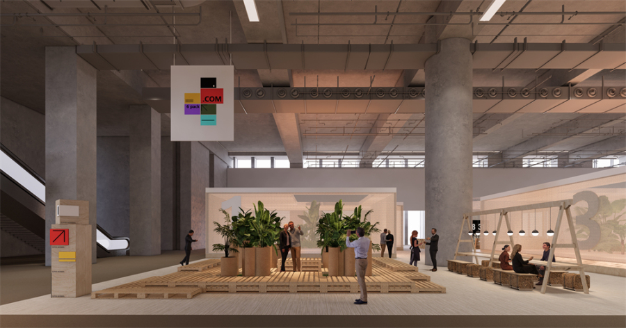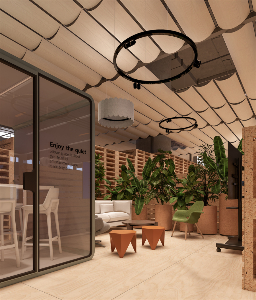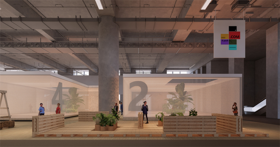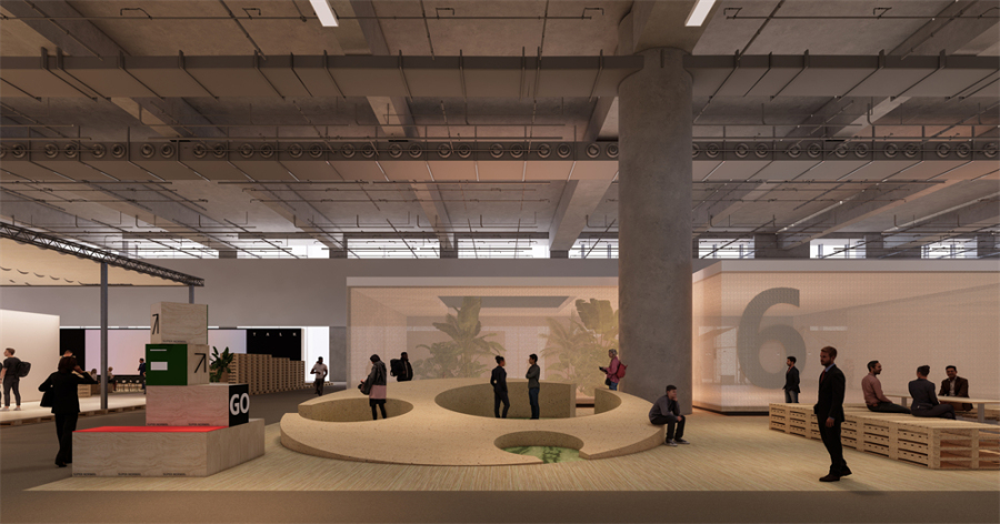 环保是当下最重要的价值观,公共区域大量使用货物运输层架,以建筑的手法构筑体量,形成围合供人使用,展会过后所有物品可以完全回收利用。