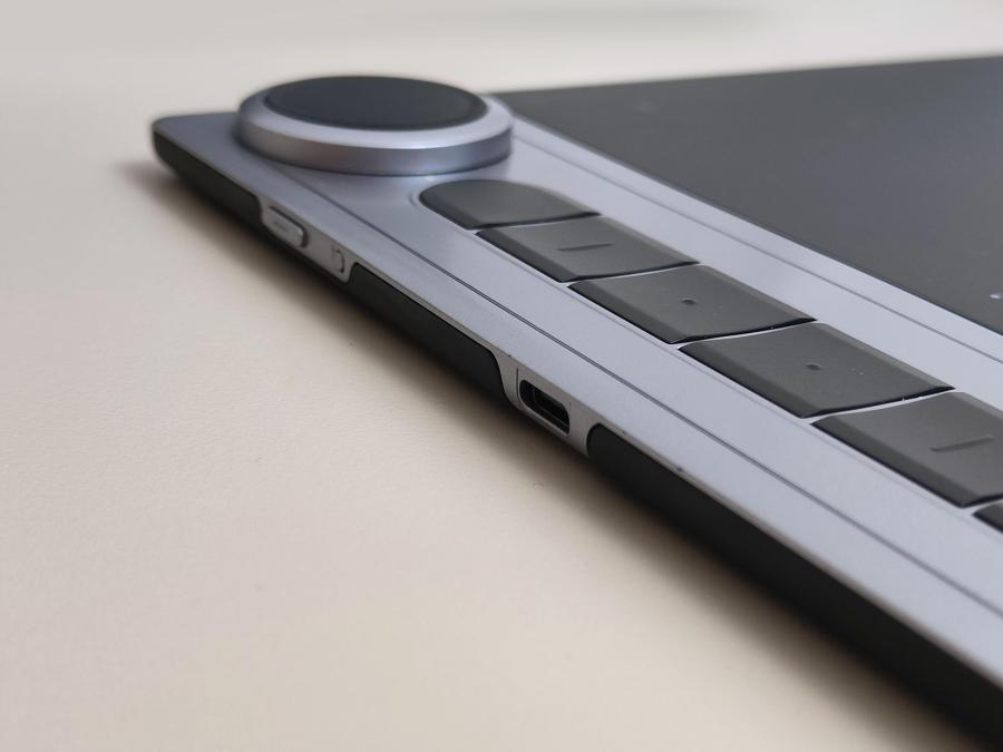 Q630M的外观看起来很轻薄,拿在手里不会觉得累赘,板面用手摸上去能感觉到很细腻,背面是金属壳,看着挺结实。正面除了6个快捷键外,还有2个超醒目的滚轮,emmm辨识度挺高的;左侧边有电源开关、蓝牙强制配对开关以及Type-C接口,整体算是比较简洁。