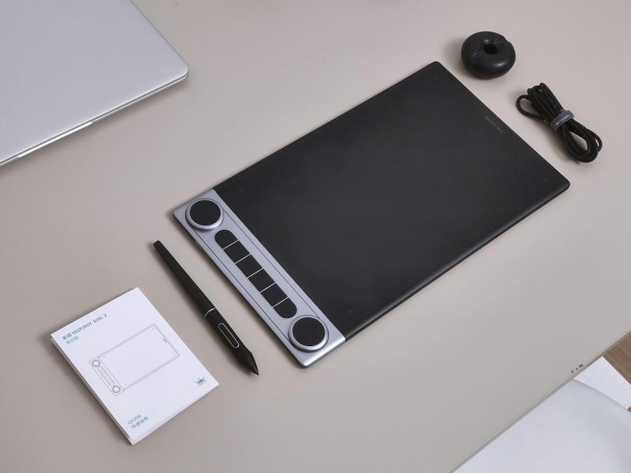 产品包装比较简洁,天地盒设计,打开盒子最上方的是产品,底下则是数位笔、数据线、笔座、手套等这些配件。