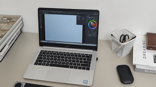 大小和我在用的14寸笔记本差不多,刚好能一起装进包里携带,方便咱去图书馆、星爸爸......这些地方接着画接着舞。之前一直都想换个安静或者轻奢的环境里创作,寻摸一下灵感啥的,奈何数位屏太重我都直接打消带出门的想法只好作罢,所以便携算得上是我的需求之一。