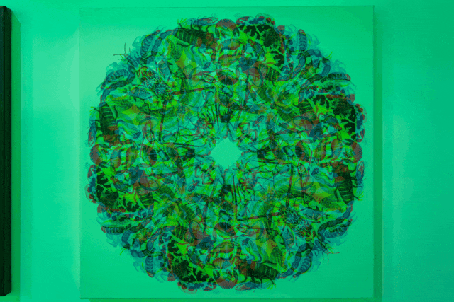 与如今流行的高科技多媒体互动相反,在这个面积超600平方米的大型展厅中,您只需要使用简易的道具,就可以在精致细腻的作品中感受到如动画一般的光学视效。色彩、线条、形状交错层叠在一起,这些由简单的RGB(红Red、绿Green、蓝Blue)三原色构成的绚丽图案,演绎出多种多样的共生关系。