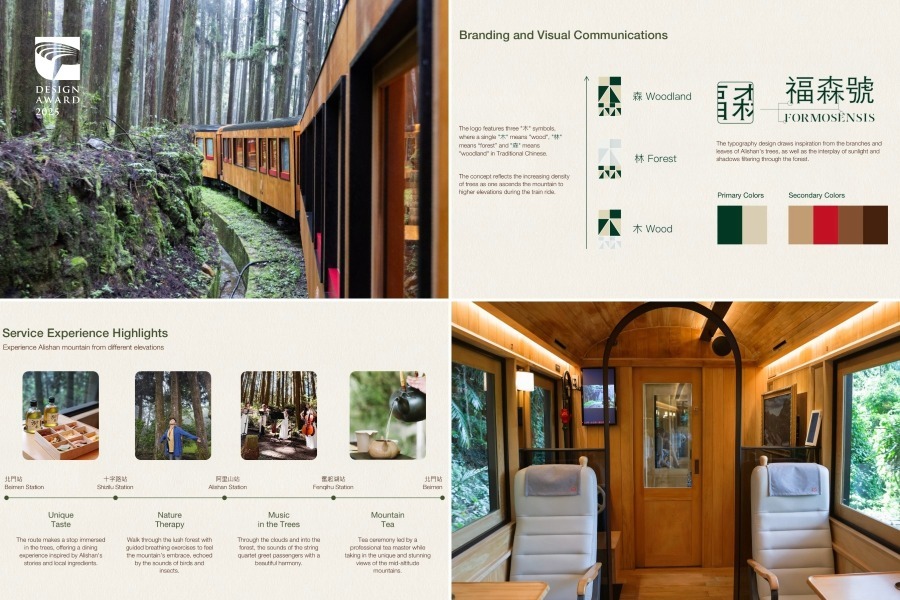整合设计类入围作品则有生活起物有限公司为勤美术馆设计的“打开想像的公共家具”,将世界经典名作转化为幽默且可互动的公共设施,让民众在日常使用座椅、伞架或垃圾桶的行为中,化身经典的一部分,体现艺术走入生活的设计理念与新体验。雄狮旅行社的“福森号”,承载阿里山林铁重建后的新篇章,从呼应森林意象的品牌识别、以红桧与扁柏打造的穹顶式车厢,结合在地社区餐饮、文化体验与低碳旅游理念,串连出兼具优雅、深度与永续价值的服务体验,引领旅客感受阿里山的自然与人文之美。本食餐饮文化股份有限公司的“杂鱼学”,结合料理、空间装置、艺术创作、展览与商品设计,以诗性微观的方式融入用餐体验,拓展为一场探索海洋的共学旅程。