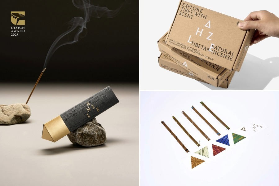 在传达设计类,根本设计的“拉孜”,是为喜马拉雅高原文化藏香品牌打造的识别与包装,其将字母“A”化为金色山顶符号,凸显品牌“山顶之光”的寓意,并结合经幡色系的三角形外包装,塑造出兼具文化象征与独特识别性的品牌形象。永真急制设计工作室的“台中绿美图|视觉识别”,从图书馆与美术馆共构的场域特质出发,以极简细腻的抽象几何,连结起建筑与绘图、书籍的意象,打造兼具高度识别性与跨领域融合意涵的视觉系统。曦成制本的“纸本炼成——设计美学试鍊”,以炼金术隐喻书籍设计的原理,并通过透明胶片、异材质纸张与错落编排的篇章,将作者暨设计师长期对于书籍设计艺术的思考、研究与实践,转化为具体的视觉语汇,展现精湛技艺。