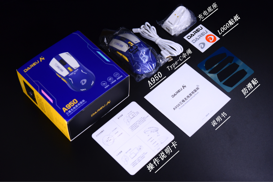 虽然是299价位的游戏鼠标,但配件方面一点都不含糊。Type-C伞绳连接线加充电底座,这可以说物超所值了。除此以外,还配备了防滑贴,操作说明卡也比较实用,连接操作基本都有图文指引。