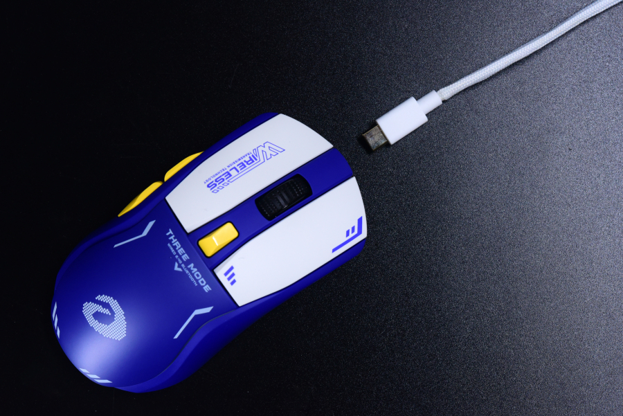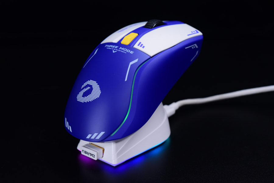 和之前出的EM901电擎版同款的RGB充电底座,充电底座前面设有USB接口,避免充电底座占用电脑接口。鼠标的连接线同样可以连接充电底座,想换到有线连接的时候可以直接换插到鼠标上。