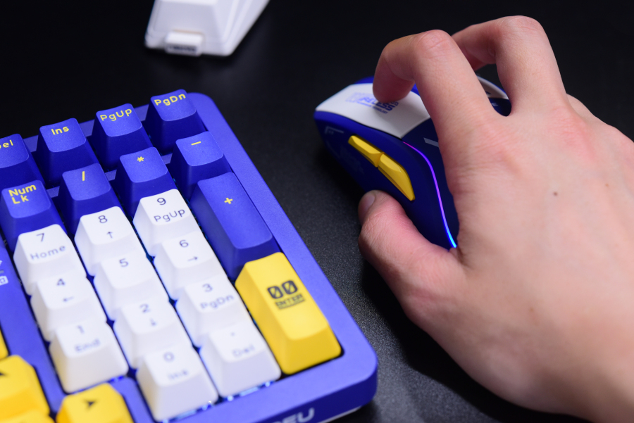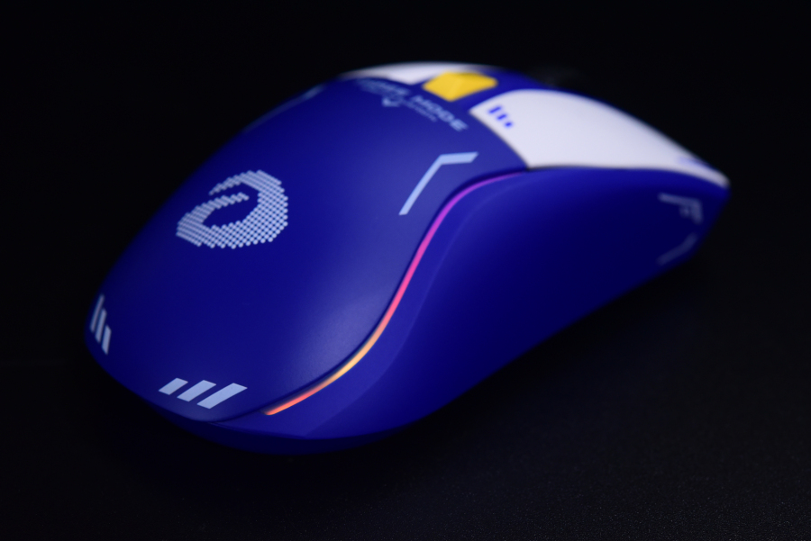 鼠标整体蓝白配色,加上黄色的小键点缀,鼠标表面还有很多机甲风设计的元素图案,视觉上具有突出的辨识感,看起来还是挺帅的。