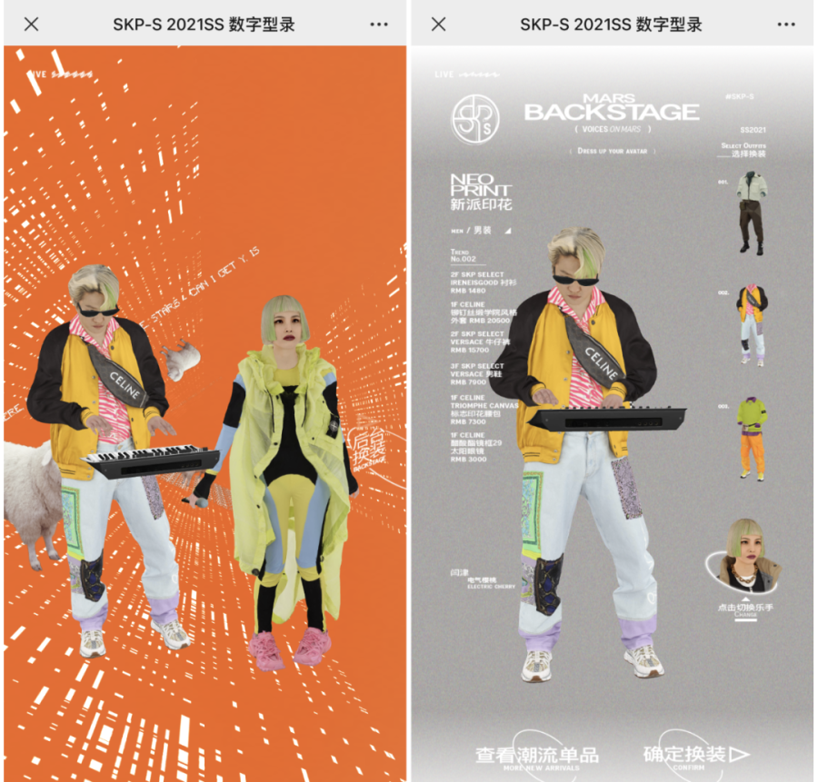 以上是某潮流时尚商场推出的H5营销活动。该策划基于Web 3D技术,将两位正在表演的虚拟乐手作为品牌潮流服饰的展示场景,虚拟人物的造型和服饰由用户自由选取。在服饰展示的基础上加入游戏化元素,让品牌的调性风格在不经意间植入到用户心智中。
