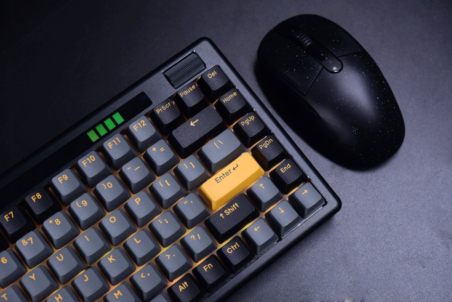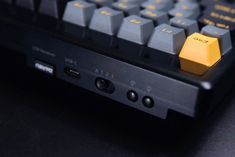 连接方式是采用有线+2.4G+蓝牙的三模式连接,蓝牙模式可以预连2台设备,切换设备的推拨按键也集成在键盘左上方。旁边两个圆形按钮则是拾音灯带的灯光模式和灯光颜色切换的控制(键盘的背光另外由FN+组合按键控制)。