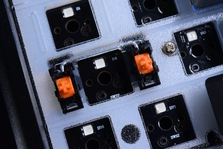 其实除了铝合金机身这种客制化比较出名的设计外,达尔优A84pro另一大特点就是客制化圈也比较喜爱的gasket结构,我们把轴体拔走后就可以看到键盘内部的大致结构,PC定位板,硅胶层,PCB,PCB下面还有一层硅胶层;整个键盘通过上下盖咬合,内部实现了真正的去空腔化。