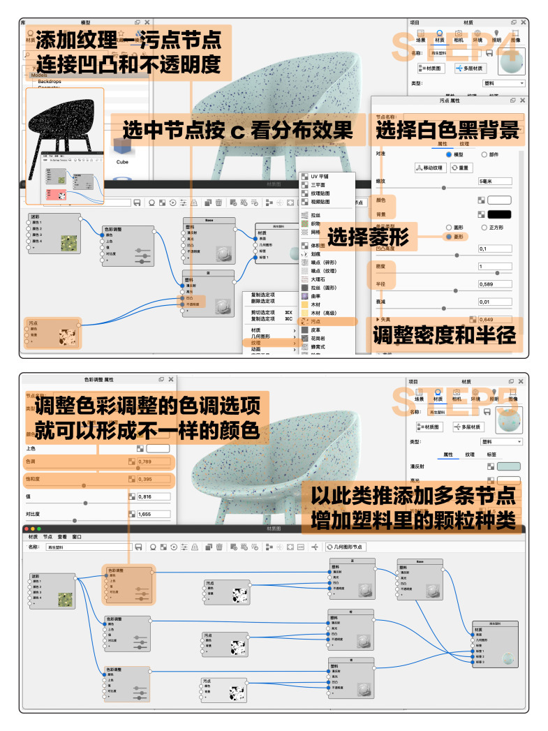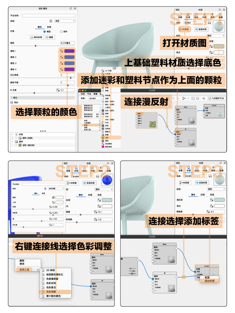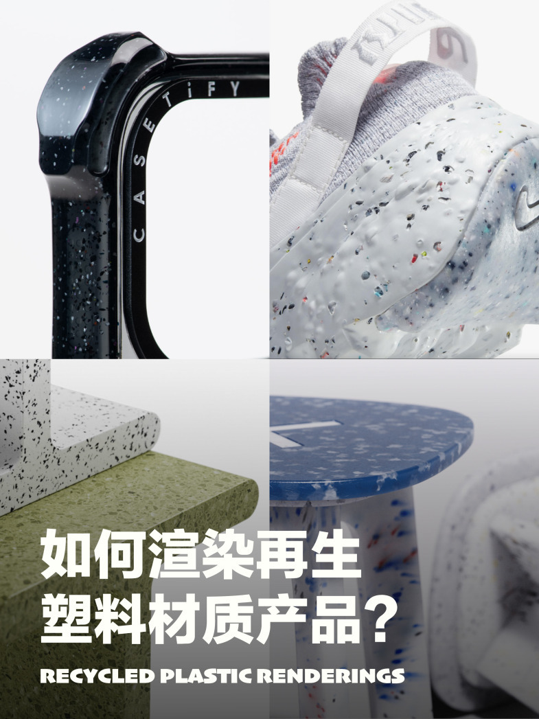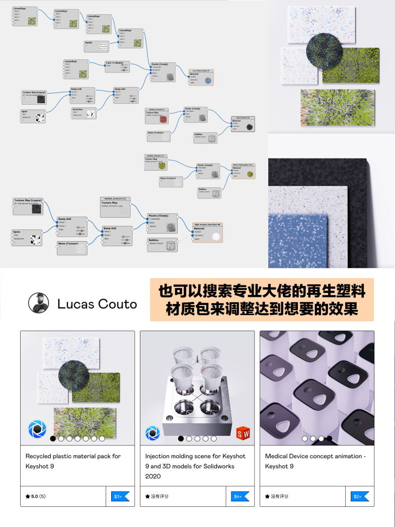 🟠 再生塑料的材质类似家装用到的水磨石材质,上面分布了不同颜色大小的颗粒,所以渲染的思路也很接近。首先在keyshot里给产品上一个基础塑料材质,漫反射选择最终效果的底色/背景色。打开材质图添加迷彩和塑料节点。在迷彩里可以调节颗粒的颜色(这个不是最终颜色)然后连接迷彩节点至新建塑料节点的漫反射。右键连接线选择色彩调整,调节色调就会出现不同颜色的颗粒。连接塑料节点至材质选择添加标签🏷️。右键新建一个污点节点,连接至凹凸和不透明度,选择棱形(通常颗粒形状都为棱形)按c看预览,颜色为白,背景为黑。调整密度半径衰减和失真,这样一种颗粒就做好了。可以按照同样的步骤添加多种颗粒,改变色彩调整节点来改变颜色,调整污点节点来调整分布即可。