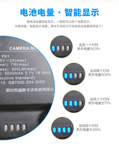 P01环形灯内置锂电池和Micro USB外接电源适配器两种供电模式,续航持久,室内室外拍摄皆可轻松应对。