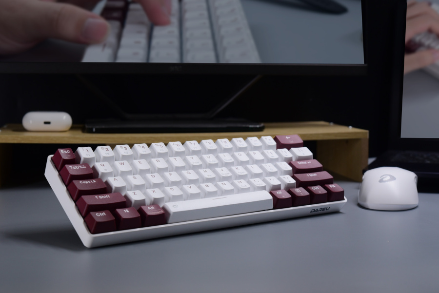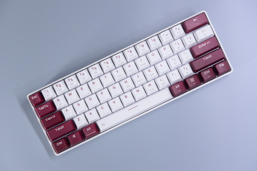 外观方面没有了以前的花里胡哨,也开始着手了配色,棕色和白色搭配显得更为简约,搭配61key的紧凑配列,视觉上更小巧。61key用起来的感觉就是,如果是文字工作者不仅看起来装哔用起来还很顺手,但如果是设计或者数据工作方面使用,就会显得很难受,缺少了F区和小键盘数字区。