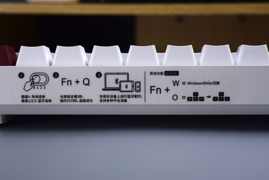 在键盘的上侧有一张连接使用说明的小贴纸,不仅把连接的操作方式都带上了,还把win和mac系统按键切换给写上,突出了一个人性化,毕竟大家都不太爱看说明书的。