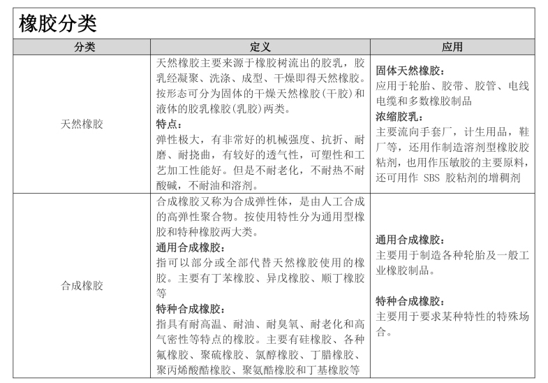 • 橡胶分为天然橡胶与合成橡胶二种。天然橡胶是从橡胶树、橡胶草等植物中提取胶质后加工制成;合成橡胶则由各种单体经聚合反应而得。