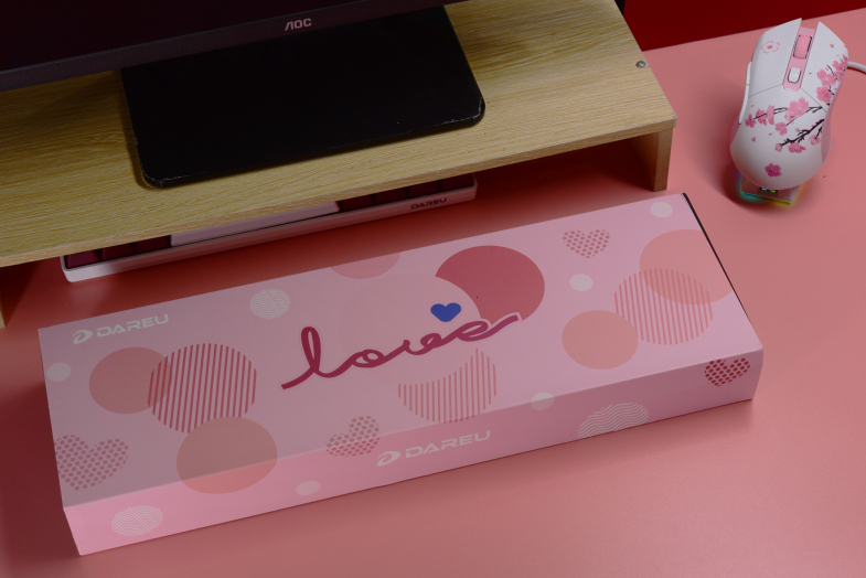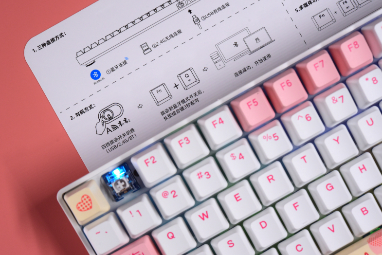 我们先来看下产品外观吧。这款A100是七夕的时候推出的,除了当时主打的粉色至上版以外,还有天空蓝和梦遇两种配色;轴体选择方面也很人性化,有快银、月白、金粉和烈焰红可以选。