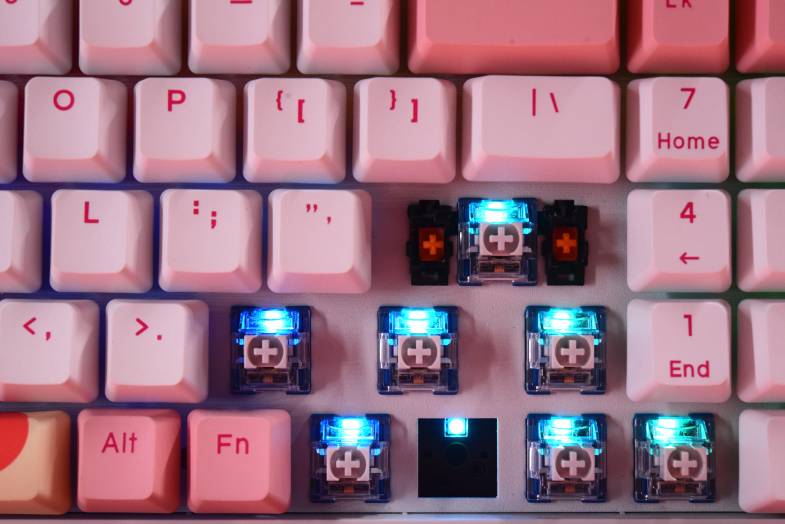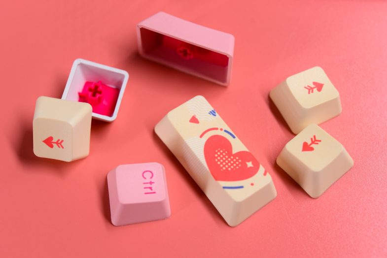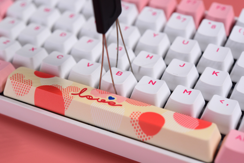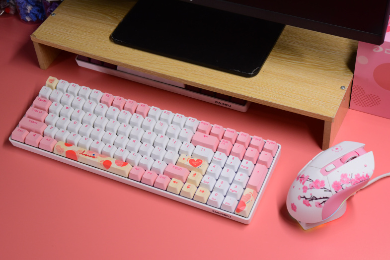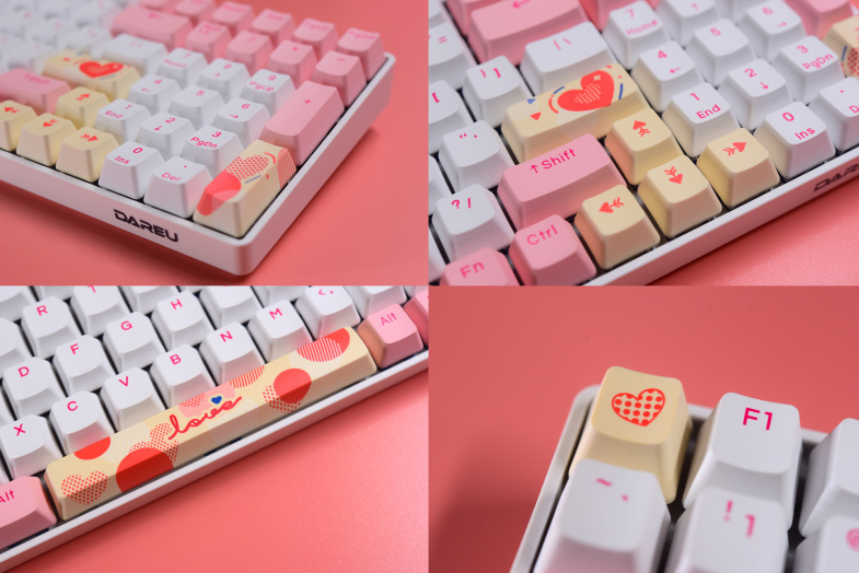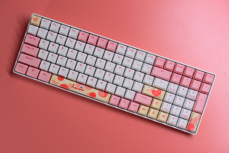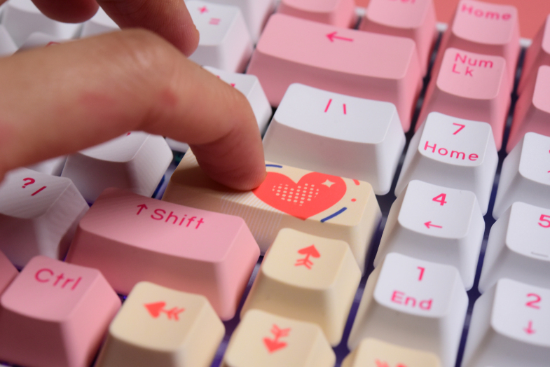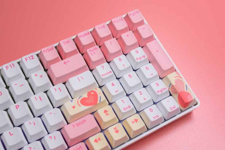 键帽外观方面,粉、白、黄搭配,但其中比较有特色的键帽上的图案就差了一点了,设计上如果可以更唯美风格就好了,当然,外观这种见仁见智各花入各眼的,自己喜欢就好。