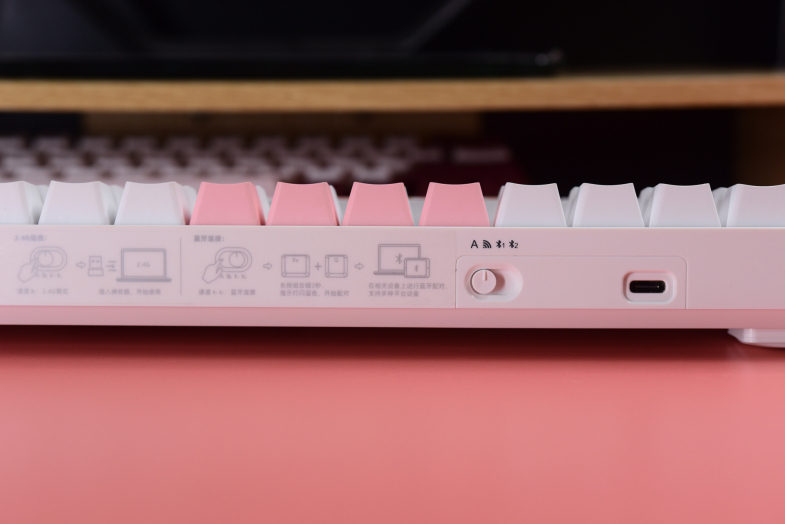 模式切换的推拨按钮变大了,一共四个档位,不适合盲操作,档位间隔太短,而且还贴心的贴了连接说明在上面,这是多怕大家不会用啊。推拨按钮隔壁是Type-C接口,支持边充边用。