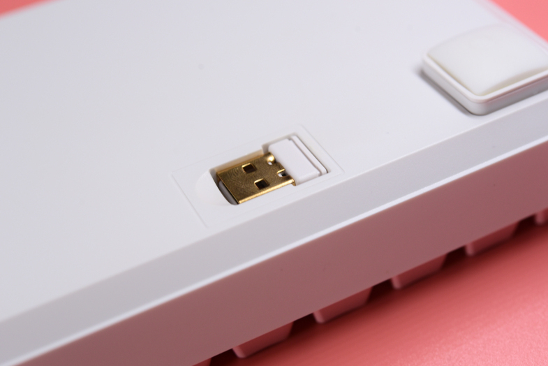 之前在达尔优某款蓝牙键盘出现过的磁吸脚架,感觉是有创意,但移动键盘很容易掉,感觉一般。然后就是接收器,直接整了个磁吸的凹槽,好评。