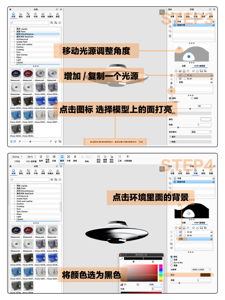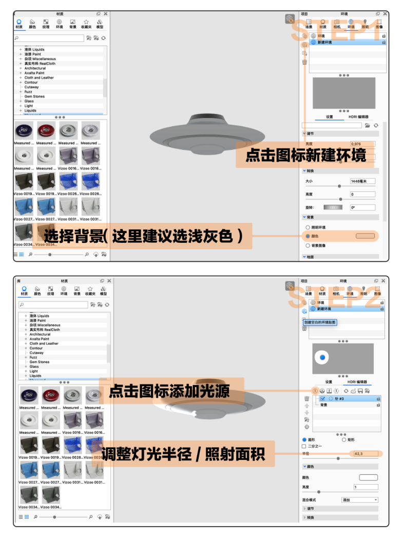 🟠 (p2-3)首先在keyshot里选择环境-点击图标新建一个环境,然后选择一个灰色的背景(因为金属质感画面通常用黑白来突出和对比,所以推荐用浅灰色做背景),然后点击大头针添加光源,调整灯光半径(照射的面积)。这里建议打两盏灯以上,一盏会略显单调。移动光源或Command鼠标左键点击需要照亮的部分。最后点击HDRI编辑器中的背景,将颜色改为黑色,增强对比度即可。
