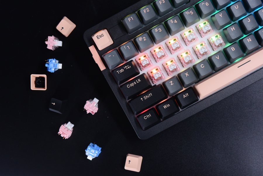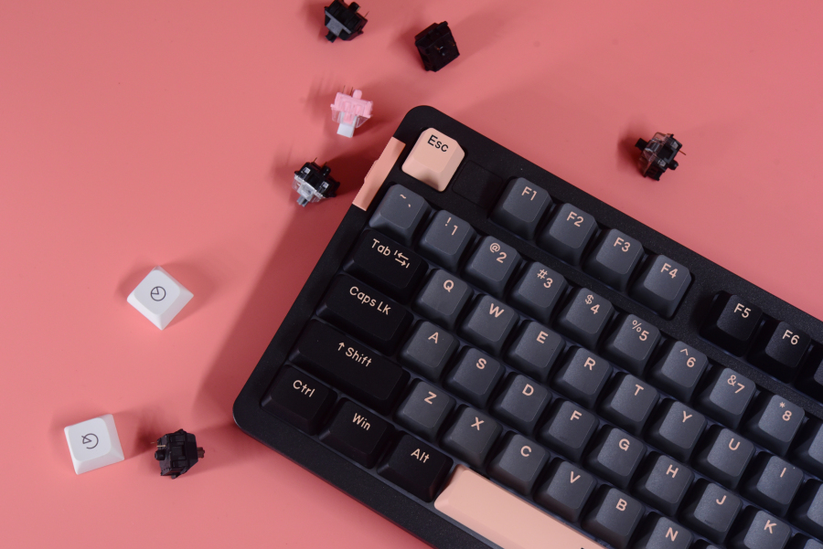 外观配色方面,采用黑灰的主色调,在后期更换键帽或者外壳换色都比较方便,这是换上了附送的粉色增补键帽后的效果,出厂键帽就是纯黑灰加粉色字符的PBT键帽。