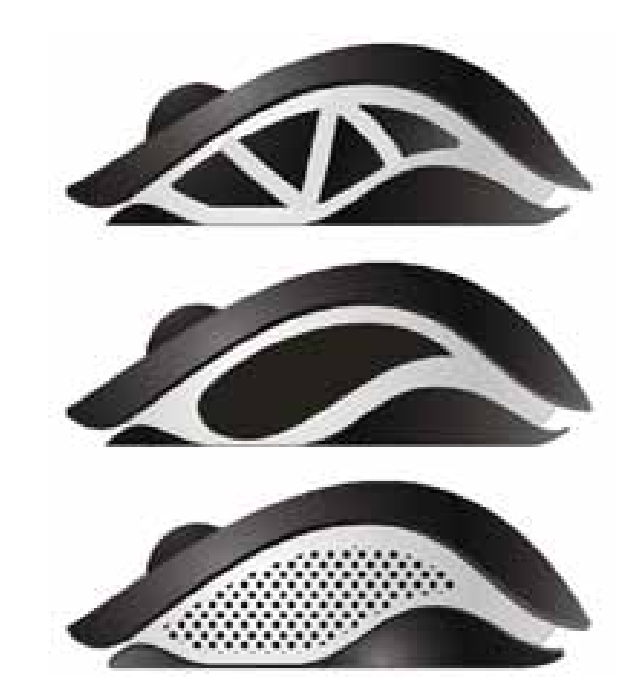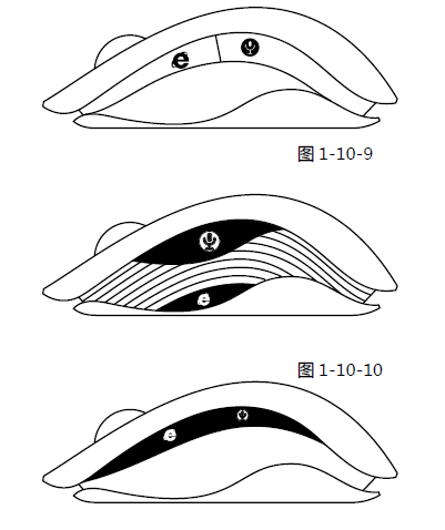 (图7-方案C中)顶部外轮廓为一个椭圆球体,想象一下用手一捏,椭圆受力发生了细微的变化,形成这个动感椭圆。侧面的语音按钮,假如还是以往的方法(透出两个塑胶按钮),那么又普通了,设计好像又回到了从前。现在的设计按钮被硅胶覆盖,同样可以按动,另外硅胶上还有时尚纹理。5. 鼠标的外在心脏(滚轮)设计,由两个硅胶套,左边黑色、右边蓝色组成。6. 三角形纹理的运用,主要角度细致的细节处理。