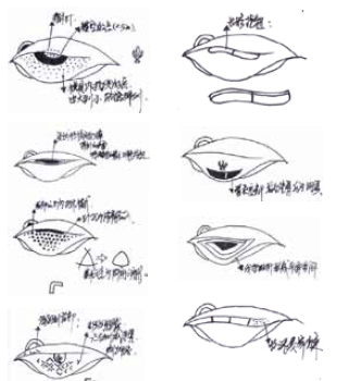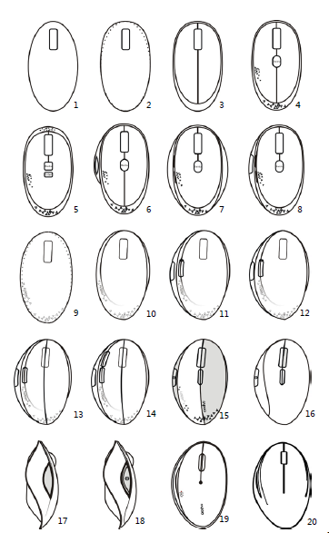 运用上文的加减法对此鼠标的概念初始到细化工程阶段描述。(图8)1中,顶视图为最简洁的几何图形椭圆, 椭圆的大小为90X50mm,这个尺寸说明了将会搭配PC和笔记本等移动设备,以此为基准进行设计加法。(图8)2中,将椭圆进行有意识的变化,将上部变大,从图形上有了倾向性,类似鸡蛋,一头大,一头小;(图8)3中,里面多了一圈曲线,这样平面就转换成了空间,两条线的距离为20mm,这条线是在油泥模型中刻画出来的;(图8)4中,中间出现了一条竖线,这样平面曲面就成了弧面曲面,其实这是个棱角,成为造型的一个识别元素;(图8)5中,此时明确中间加上了圆形按钮,作为快捷进入浏览器,左侧的三角形是语音孔,底部是镂空三角形图案;(图8)6中,加法进行局部调整,尝试强化出左侧快捷按钮,即强化“互联网”的概念;(图8)9中,尝试进行减法,重新回到椭圆的原点,尝试在形态语义上设计,并非形体加法上;(图8)10中,将主体变得与众不同,由静止变为运动,椭圆明显的向右倾斜,滚轮也向右倾斜了15度;(图8)11中,强化这个动感,让底部突出一个特色,左侧形成一个棱角(动态线)。形态整体向右倾斜,向右扭动;(图8)12中,细节是最能打动人的,会发现头和尾变成了尖角。因为此时我想引用另外一个元素(叶子尖),后来发现这个元素是多余的,减法的思想让我果断删掉;(图8)13中,在电商上销售的时候,正面务必要有足够的特色来吸引消费者。所有顶部一分为二,这样分割上带来了亮点,配色的可能性会更大,减法思想认为这是多余的;(图8)16中,设计深化阶段将结构和电子工程师进入项目,可量产纳入考量,这里的分模线有了改动;(图8)17中,从侧面主视角上,图形化突出“语音”按钮,强化思想指引一定要强化;(图8)18中,通过造型落差,继续强调语音功能;(图8)20中,模具内双向滑块,保证上盖一体化出模。