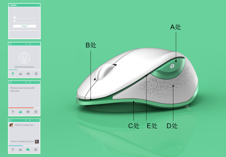 设计简介:鼠标线条飘逸、握感舒适,是美学和人体工学完美融合。经物种品类说指引,展示了律动漂浮、活力自由形象,鼠标的每个角度均能带来新鲜的视觉感受。工业设计着重体现以下三点:❶新品类和新生物,通过学习物种的起源并研究鱼类的形体语言,鼠标形态塑造新生物感,类似鱼类一族的柔软飘逸律动,与传统鼠标从DNA上界定开来,引领一个全新品类。以至于轮廓、分割、分形线、曲面都学习生物自然规律,例如“魟鱼”的眼睛和浮动身姿与热带鱼的装饰色彩完全不同(图1),依据几何学指导并游走其约束(图2),寻找多个用户并手戴砂纸手套将体块冲刷打磨30天(图3),久之形态和曲面在手掌的摩擦下接近贴合。侧面按钮提炼为“眼睛”图形(图4-A处),三维空间凸出强化,代表发现和观察,强烈的符号示意语音功能。前部张开的嘴示意语音述说“拾音”功能(图4-B处)。❷形象和语言重新塑造,源自生物以至于清新、灵活新形象与传统鼠标的商务厚重风格截然不同,上部曲面干净整洁与底部细线律动形成对比(图4-C处)。❸基于全塑胶设计,在基于塑胶基材的上,仅强调少部分色彩,如在底部色彩呈曲线,曲线360度波动变化带来新鲜的视觉刺激,线条圆角锐气锋利但不在手掌触及之内,不会影响抓握。而侧裙的肌理散点纹路迎合当下设计趋势(图4- D处),部件侧方“行位”出模带来独特的图形识别(图4-E处),形成的缝隙里纵深设计出现细密纹路。