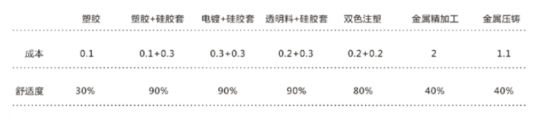 对于鼠标的核心滚轮,很有必要研究其本质。横向游戏滚轮和普通滚轮,纵向分为低端、中端、高端。市面存在滚轮见对比表格见(图9)。在这六个空间区域内,滚轮的面貌有了很大的变化,变化之中有一些共性。“普通低端”区域内,多为圆润的滚轮,产品售价在50元以下,降低成本是关键。材料多为单一的塑胶和双色注塑。“普通中端”的区域内,会发现形态倾向中庸。多为电镀滚轮轴加硅胶滚轮套。(图10)成本均为0.6元。“普通高端”的区域内,材料更为高档。多为锌合金等合金材料(例如微软赛威鼠标)。“低端游戏”区域内:强调呼吸灯发光,新鲜的视觉效果。例如达尔优牧马人、大水牛鼠标的小厂商等。“中端游戏”区域内:强调手感和纹路。“高端游戏”区域内:强调细节和品质,即低调的背后全是华丽。