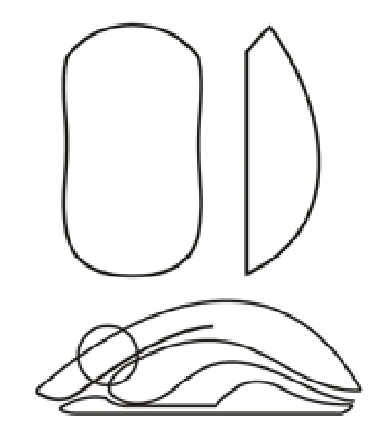 设计的原型处于空间内。如(图6-A中)以线框的形式粗略的描绘最初概念,三个模块围成形体,中间是镂空的。形体的前面像动物说话的嘴巴,略微张开,声音的气流贯穿到鼠标全部,以至于形体的尾部也是张开的。如(图6-B中)将线框其图形化,探讨图形与图形之间的关系以及带来的视觉冲击力和特殊性。这是一个启发思考的阶段。连贯性,内在联系性。图形可以借鉴LOGO的图形设计技法。在这个阶段进行细化,调节线条和图形面积,利用形式美法则,寻找变化与统一、对比与调和、节奏与韵律、对称与均衡、调理与反复、比例与尺度,寻找最适合形式美。如( 图6-C中)从侧视图,可以对分件做出决定。此时要思考配色有何种优势,大概的分模具开始这时候主要视觉出来了。深化主要视觉,修整,将风格倾向最大化,要么流线要么圆润要么英朗。如( 图6-D中)“1”指的是外轮廓,也是风格线,制约着形态的风格走向。可以看到T8的轻盈的弧线、T5的速度直线、T120P的拱线(T8 T5 T120P为雷柏产品)。“2”负形特征。“3”正形特征曲面。“4”小特征,细小曲面辅助,考虑人体工学手感、美感,细节深化侧视图,此时将结合油泥模型“1”手掌区域,是鼠标的最高点,受力点在手的“头状骨”高度在36-42毫米之间。“2”手掌虎口,一般平滑,不要锋利(这里的平滑是相对的,随着支撑点而来,例如技嘉鼠标就有棱角,但是手感同样优越)。“3”食指,此处是食指和中指点击的地方,尺寸若是高了,滚轮则不会露出。尺寸若是低了,食指过于弯曲手感不适。“4”拇指,包含“抓”和“拿”,具体详见文章《鼠标五感》。尺寸在60-72毫米之间。“5”影响无名指第二关节。“6”影响无名指指肚。“7”细小曲面,共促风格的形成,影响外轮廓剪影和曲面光影。“8”手腕部,一般低于12毫米。
