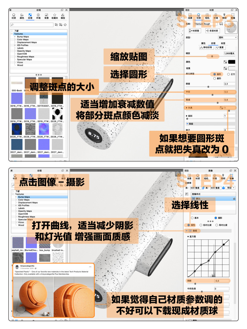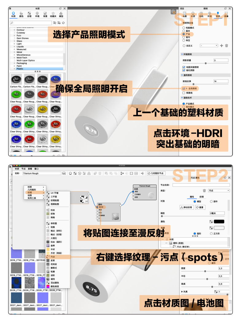 🟠 首先在keyshot里设置好产品照明模式,打开全局照明,为产品上一个基础塑料材质,然后点击灯光HDRI调整产品表面的明暗。打开材质图/电池图,右键点击纹理-污点(spots),将贴图连接至漫反射。调整贴图大小,选择圆形斑点,调整半径以改变每个污点的大小,适当增加衰减,这时候会产生一些灰一点的斑点,更具有层次感,最后如果需要不同形状的斑点则可以调整是阵雨,需要全部是原点则把失真改为0。(如果不喜欢自己调的材质,可以搜索speckeld plastic材质球)最后点击图像-摄影,选择线性,根据想要的效果调节曲线即可。