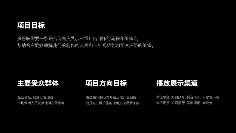 本项目视频主要应用于展会,接待展示及线上传播,通过一条视频让客户了解三维广告的优势点以及制作流程。