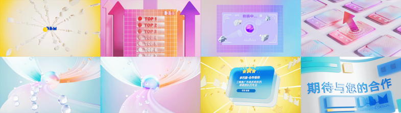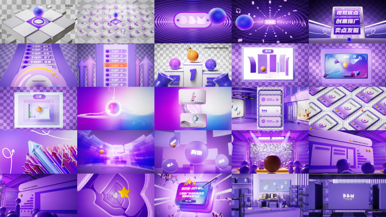 基于这样缘由,第二版统一以紫色为主色调,其他色彩为点缀色,强化画面记忆度,提升大众对多巴胺色彩的感知,展现三维广告感性的一面。