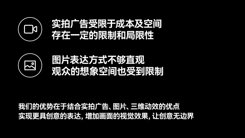 实拍广告、平面海报和三维视频是广告呈现三种主流方式,实拍场景受限于成本和空间,存在一定的限制和局限性。图片表达方式不够直观,观众的想象空间也受到限制。而三维广告能高效便捷展现产品功能点,具有一定的优势性。