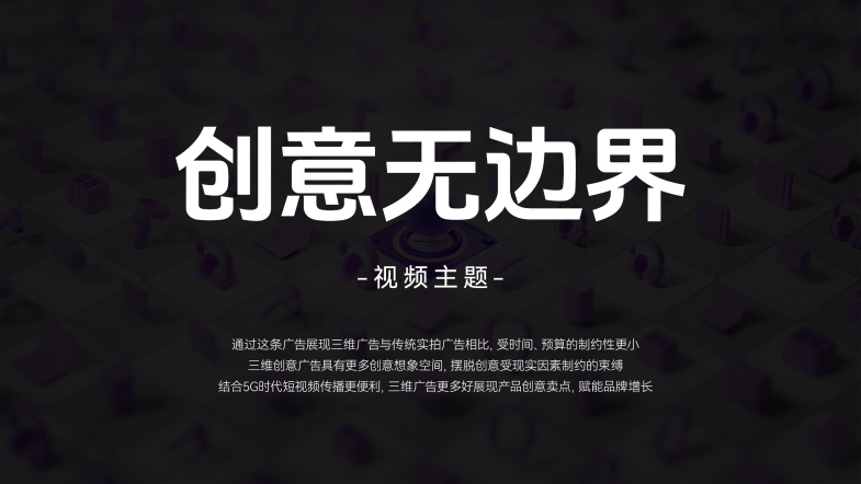 定义目标后,确定视频的创作主题,三维广告与传统实拍广告相比,受时间、预算的制约性更小,具有天马行空的想象。具有更多创意想象空间,摆脱创意受现实因素制约的束缚,因此我们总结提炼“创意无边界”的创作主题。