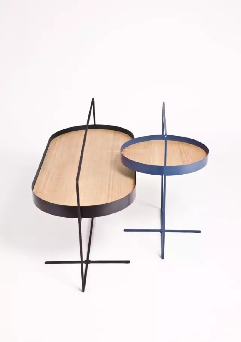 整体视觉上仅仅是一根线条状的托住整个桌面形成一种有可能倾倒的趋势,然而底下由交叉十字形成的架子托住桌面却又十分稳固,让视觉心理和实际使用情况达到一个临界点。