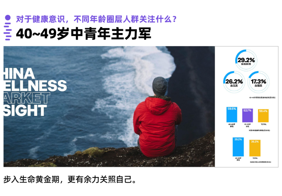 40-49岁的人群,不知不觉人到中年。一直在为工作与生活打拼的他们,如今家庭与事业渐渐趋于稳定,但有些如慢性病方面的疾病隐患却逐渐冒头。他们感受到身体的变化,开始对身体机能方面的健康更加关注。他们认为想要减少这些慢性病症状,日常的饮食生活很重要。为了健康,他们不介意花费一定的时间或费用。