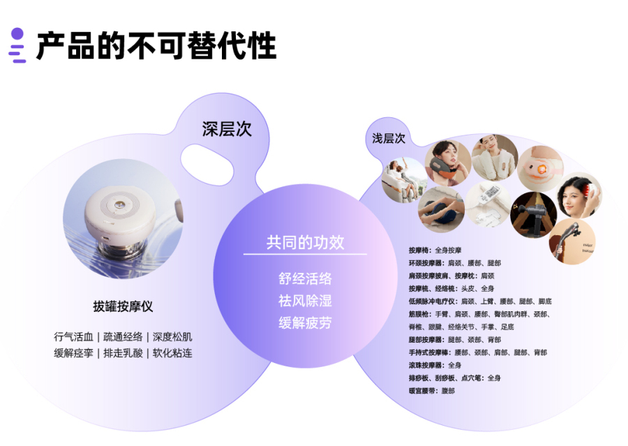 与传统的按摩器(机械捶打/EMS/加热功能)相比较,拔罐理疗产品减少对皮肤表层刺激,更能于身体深层作用,产品融合智能呼吸拉伸控制和负恒压升降的控制算法,精准控制流量输出,于罐内实现"呼吸拔罐",并在罐内还原古法艾灸雀啄灸疗法,从点到面、且面中含线、线中有点,对使用部位进行动态刺激,一灸即透。