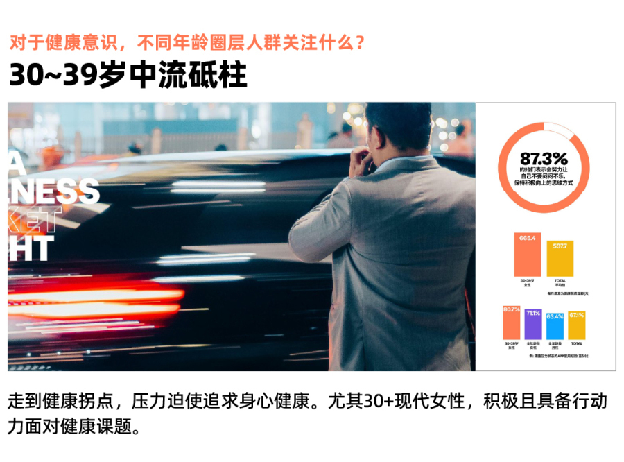 处在30-39岁年龄段的女性多数已结婚生子。而这个阶段的孩子较小,需要妈妈付出更多的时间和精力。同时,这个年纪的女性在职场大部分是中流砥柱,并面临激烈竞争。家庭与工作趋于饱和、踩在健康分水岭的她们,除了身体,他们对心理健康的重视也尤为突出。