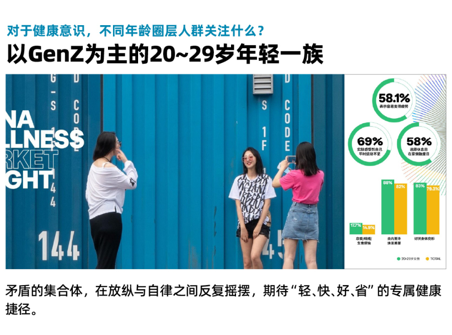 以GenZ为主的20~29岁年轻一族多数刚刚步入社会,工作时间也相对较长。容易疲劳/平时运动不足/休息日经常在家里懒散度日较为常态,他们希望尽情地吃自己喜欢的食物来释放压力,对自己的健康评价较低,采取健康行动的人数也是全年龄段中最低的。