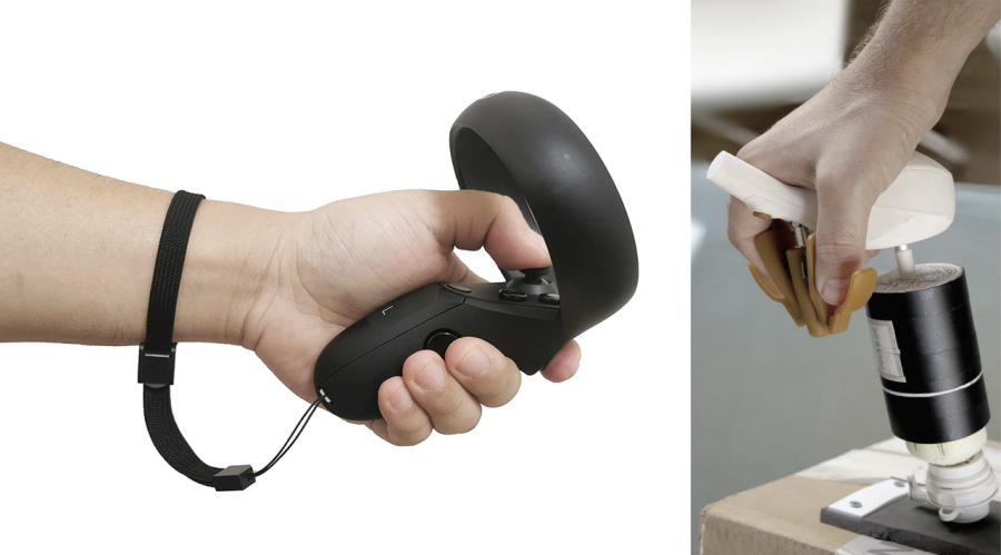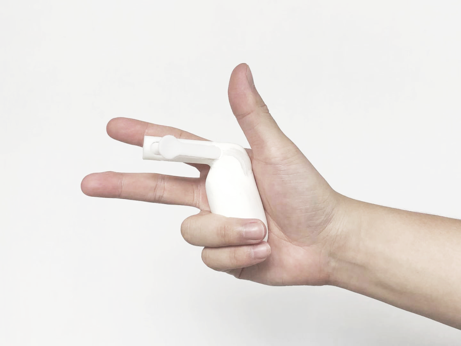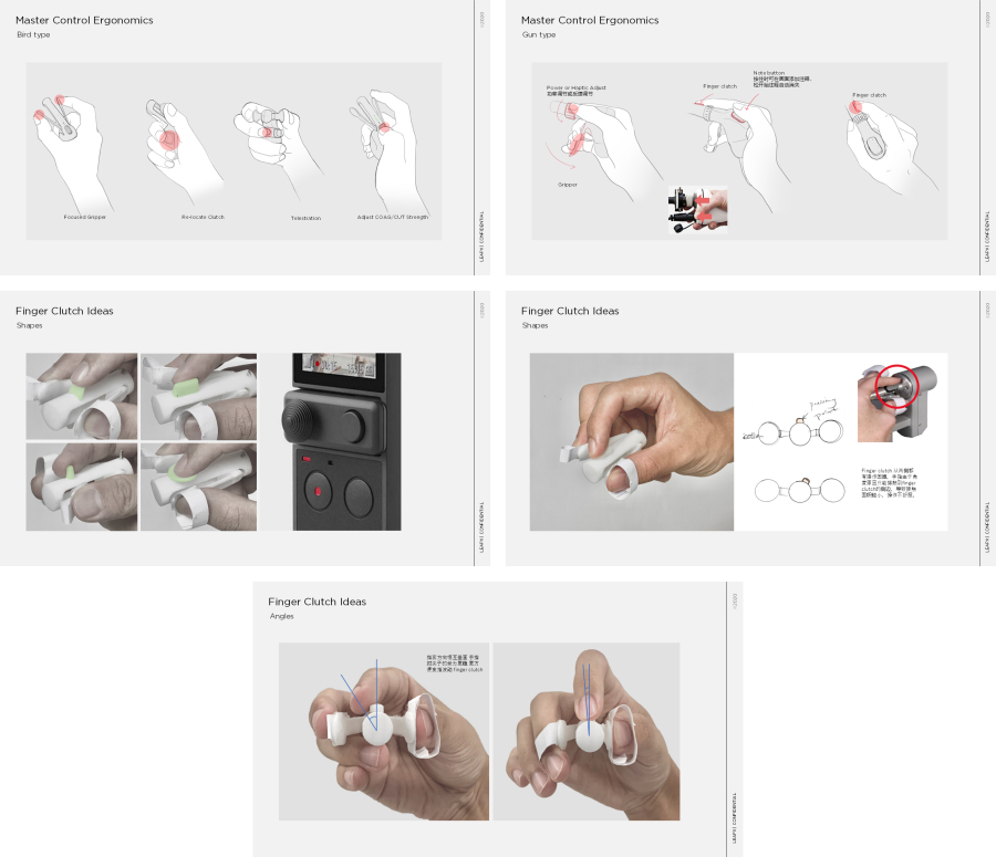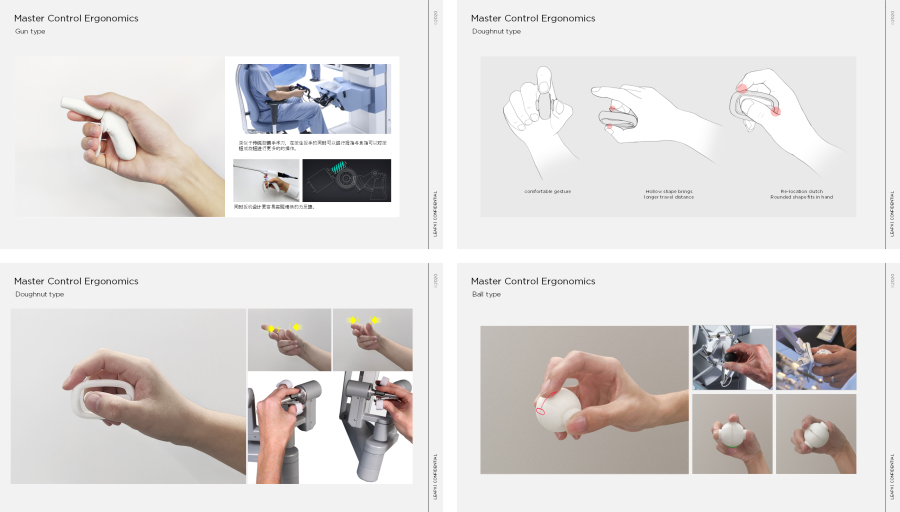 传统的夹持器依靠拇指和中指控制移动,施力面积相对较小,对夹持器的移动控制较为费力。我们设想,如果夹持器具备握把结构,就能让移动控制更加方便,又能使夹持控制由食指和拇指独立完成,减少移动对夹持动作的干扰。对此我们参考了各类其他行业的手持控制器,并制作了大量不同原型进行测试和验证。
