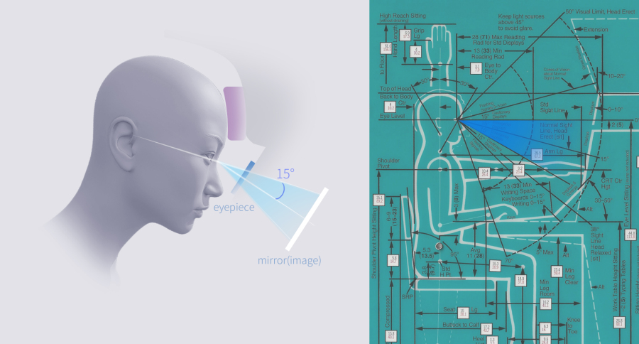 根据人体工学数据,人正常的视线范围处于眼睛水平线下 0 - 30° 的区域。我们根据这个数据调整了目镜与头托,将图像中心置于眼睛水平线下方 15 度的位置,让手术医师能够获得舒适的支撑与视角。