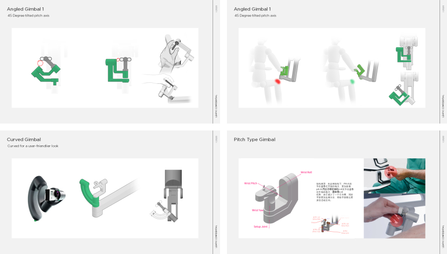 云台的形态会影响医生手部操作空间,为此,我们对云台的各种形式进行了尝试(比如圆弧形结构),力求最大程度减小云台对手术医师操作的干扰。