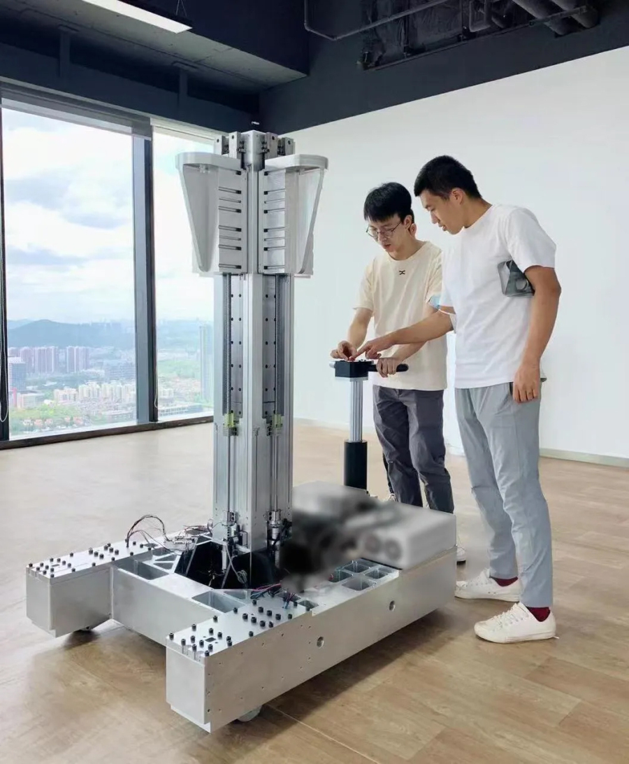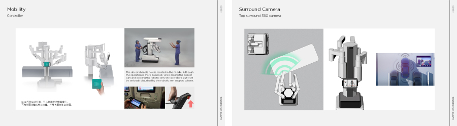 由于四只机械臂位于驾驶握把的前方,可能会对驾驶的医护人员造成视觉遮挡,因此现场往往需要两个人配合操作移动。为此,我们曾设想增加一块监视屏和一套摄像头,将前方图像传输至屏幕,如同停车辅助系统一般,辅助医护人员一个人就能完成患者手术平台的定位操作。